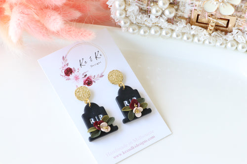 Tomb Polymer Clay Earrings – Handmade Gothic Floral Halloween Earrings | Spooky Elegant Jewelry | KeandKi Designs (Black)