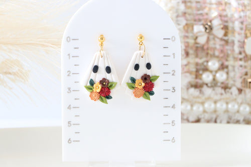 Pumpkin Floral Polymer Clay Earrings – Handmade Autumn Halloween Earrings | Fall Floral Jewelry | KeandKi Designs ( Tri color Red teraccotta beige Floral )