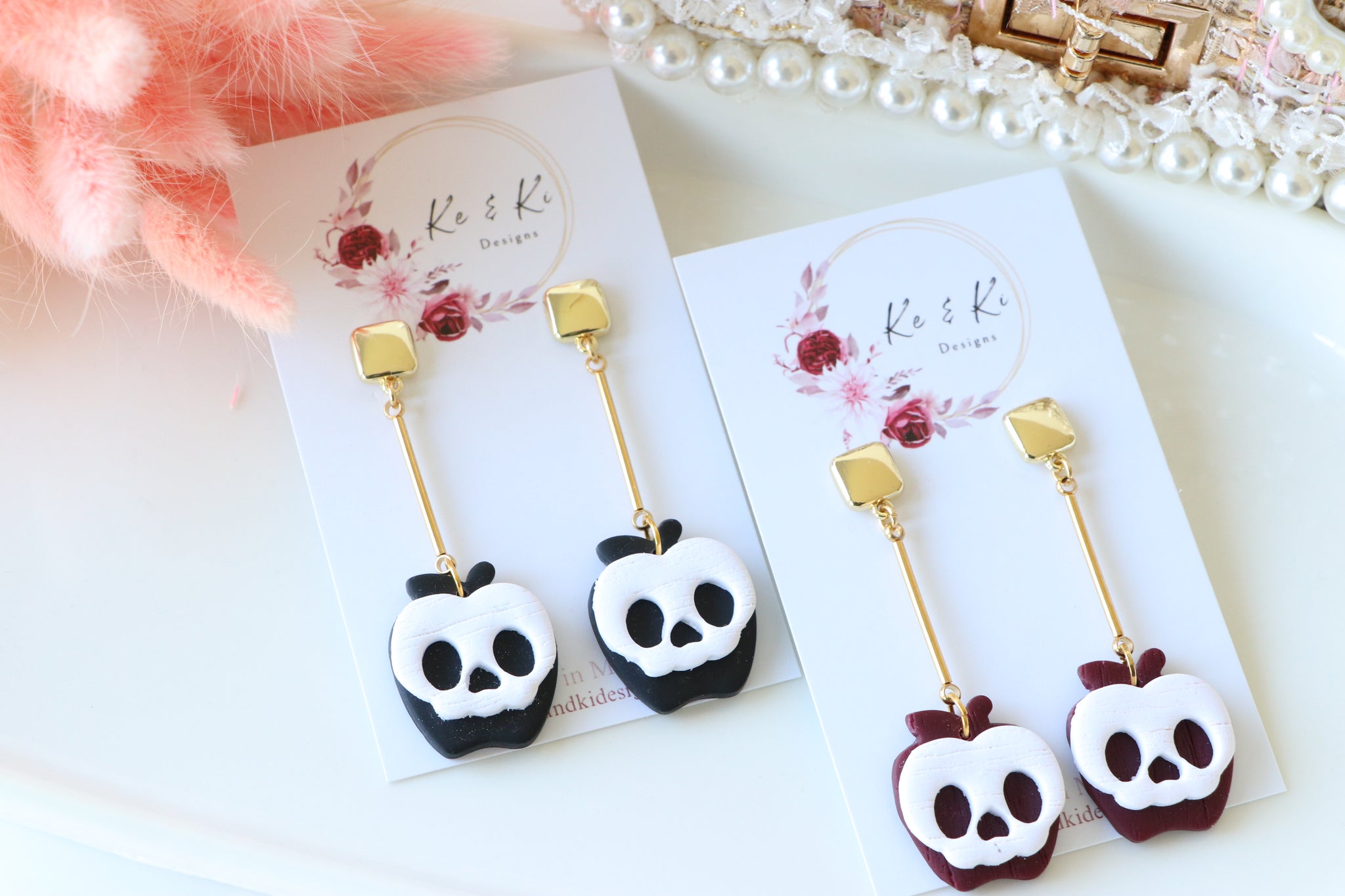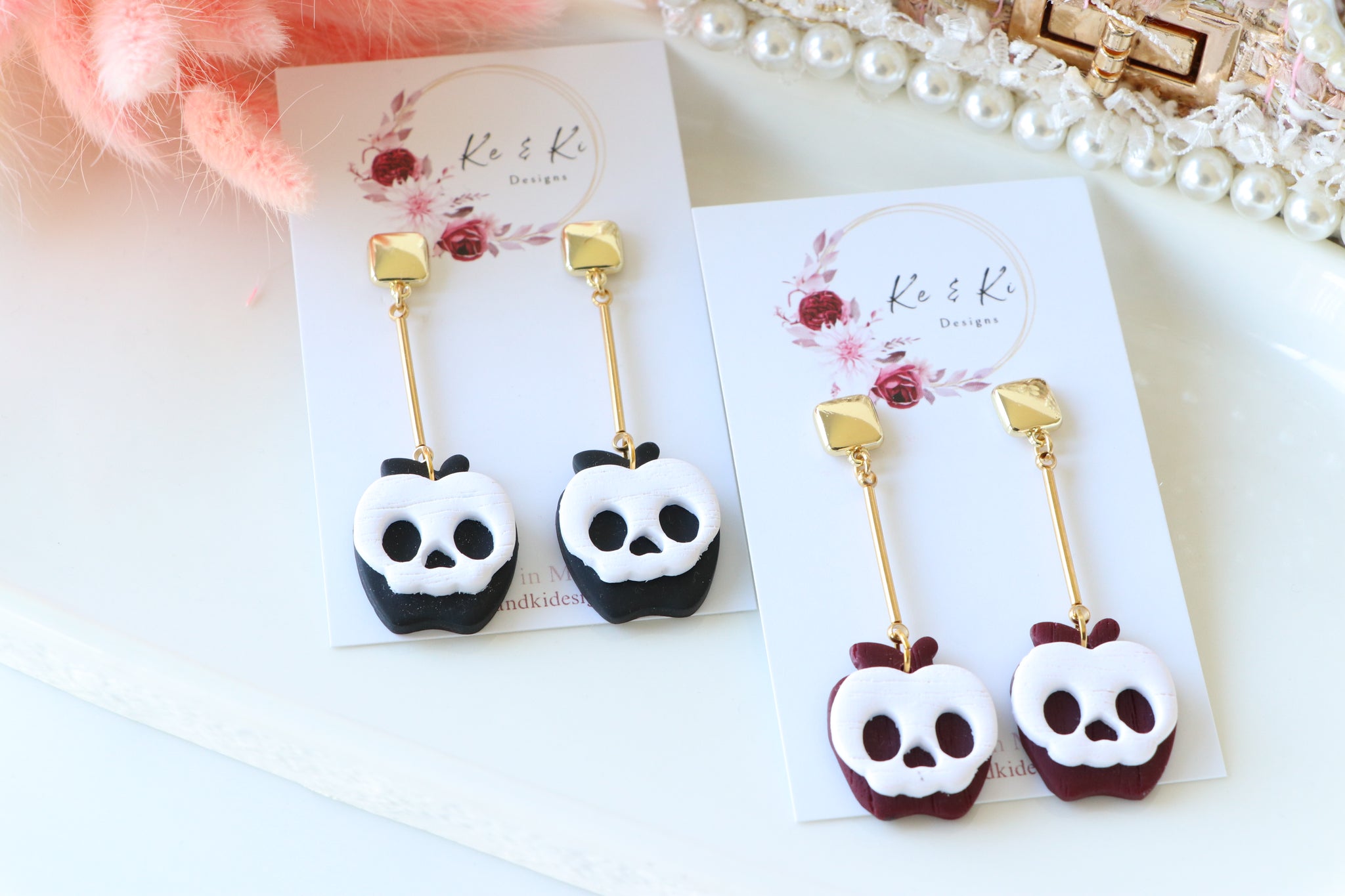 Apple Skull Polymer Clay Earrings – Poison Apple Halloween Earrings | Handmade Spooky Cute Jewelry | KeandKi Designs (Black)