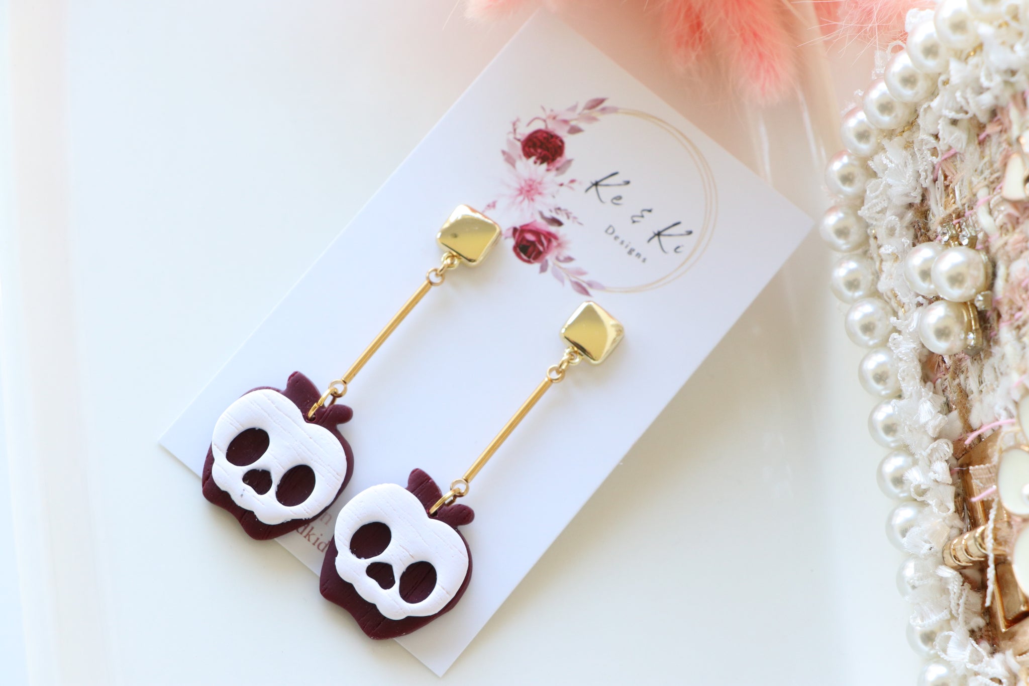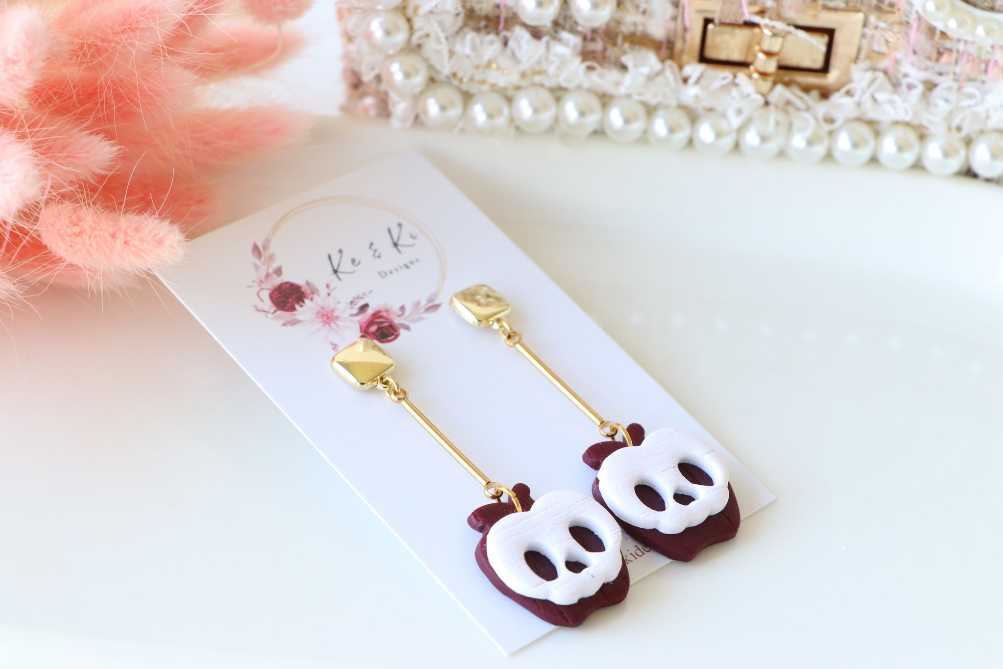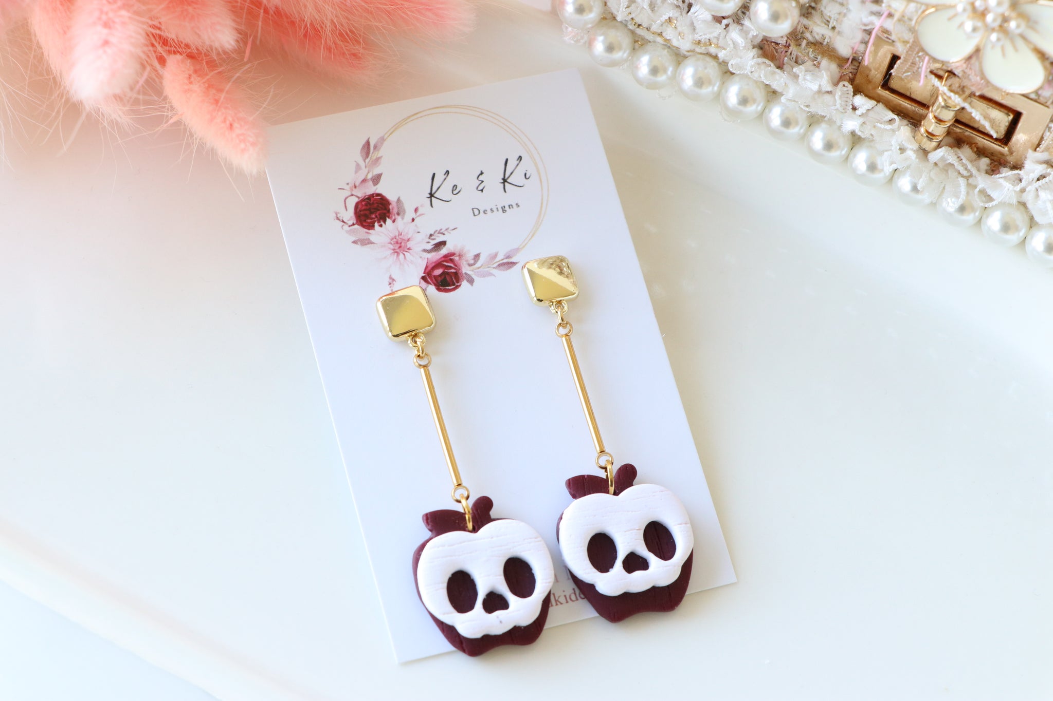 Take a bite out of spooky season with our Apple Skull Polymer Clay Earrings, a hauntingly cute piece of handmade Halloween jewelry from KeandKi Designs. Inspired by the poison apple aesthetic, these skull-shaped apple earrings perfectly mix fairy tale darkness with feminine charm.