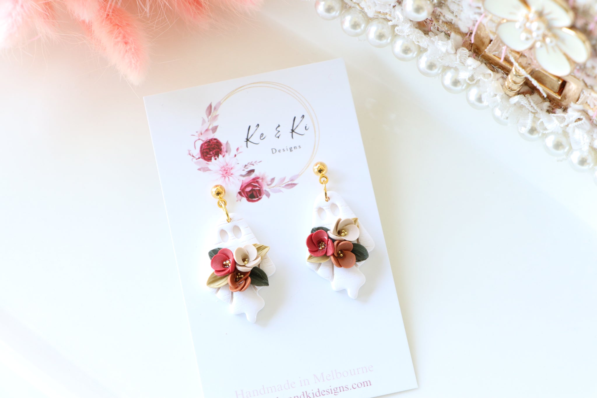 Floral Ghost Polymer Clay Earrings – Spooky Cute Halloween Earrings | Handmade Feminine Ghost Jewelry | KeandKi Designs ( White terracotta red beige Floral )