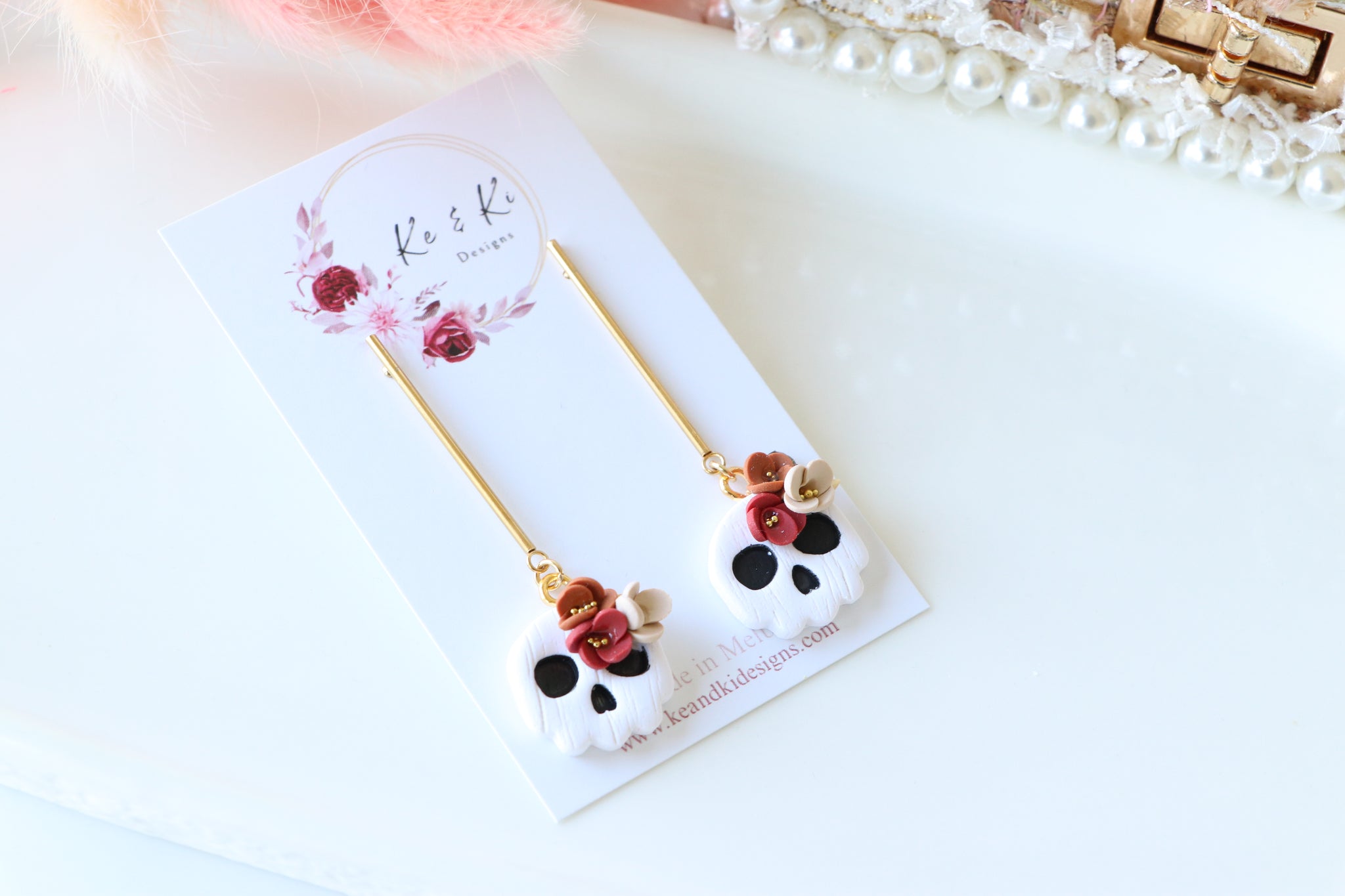Floral Tiny Skull Polymer Clay Earrings – Mini Gothic Floral Earrings | Handmade Spooky Cute Jewelry | KeandKi Designs (White)