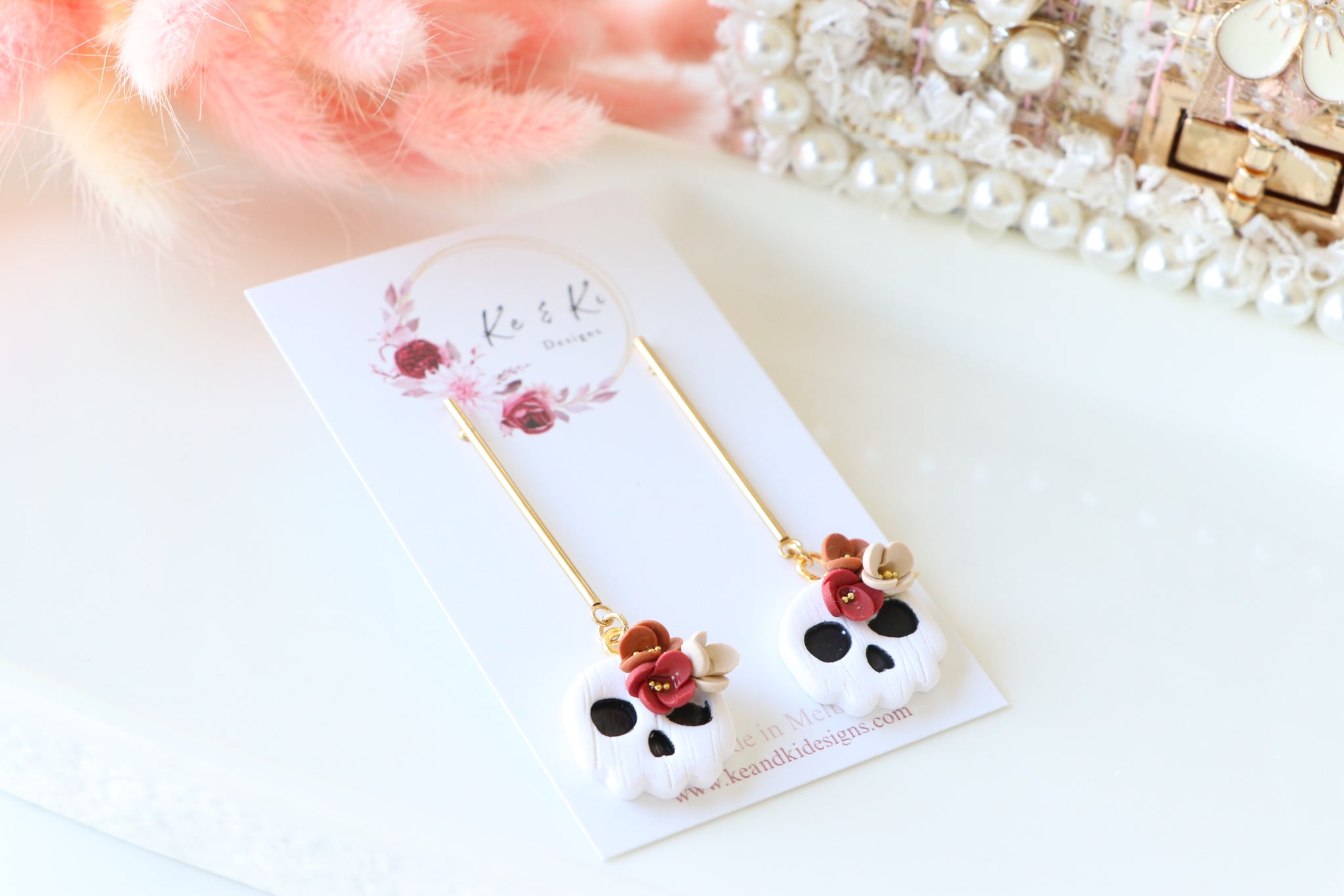 Add a touch of delicate darkness to your style with our Floral Tiny Skull Polymer Clay Earrings, handcrafted with love by KeandKi Designs. These mini skull earrings combine feminine florals with subtle gothic charm, creating a look that’s soft, stylish, and spooky in the sweetest way.
