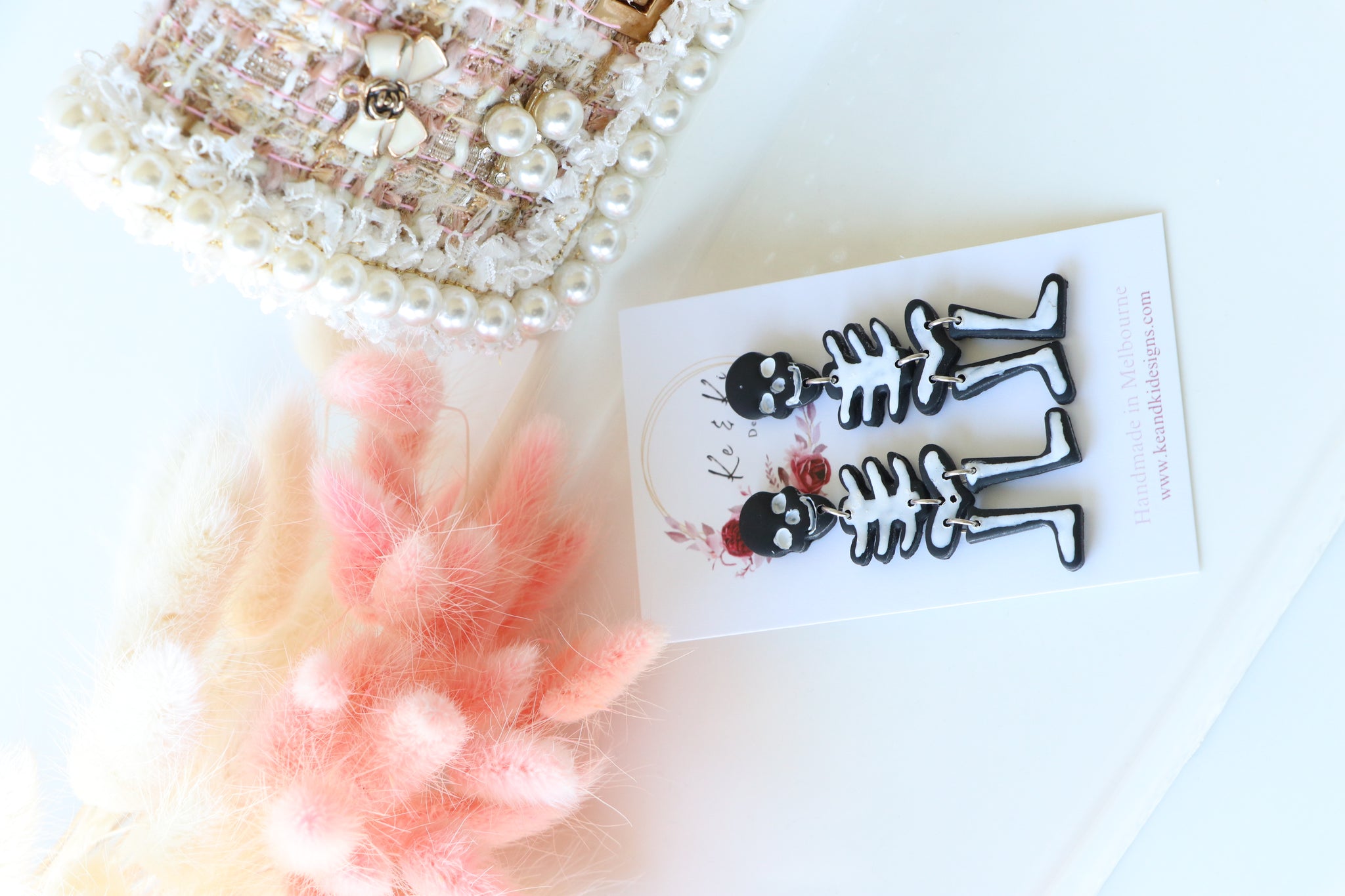 Step into spooky season with confidence wearing our Skeleton Polymer Clay Earrings, handmade with care and creativity by KeandKi Designs. These statement skeleton earrings mix Halloween fun with delicate handcrafted detail, offering a spooky cute twist that’s both bold and feminine.
