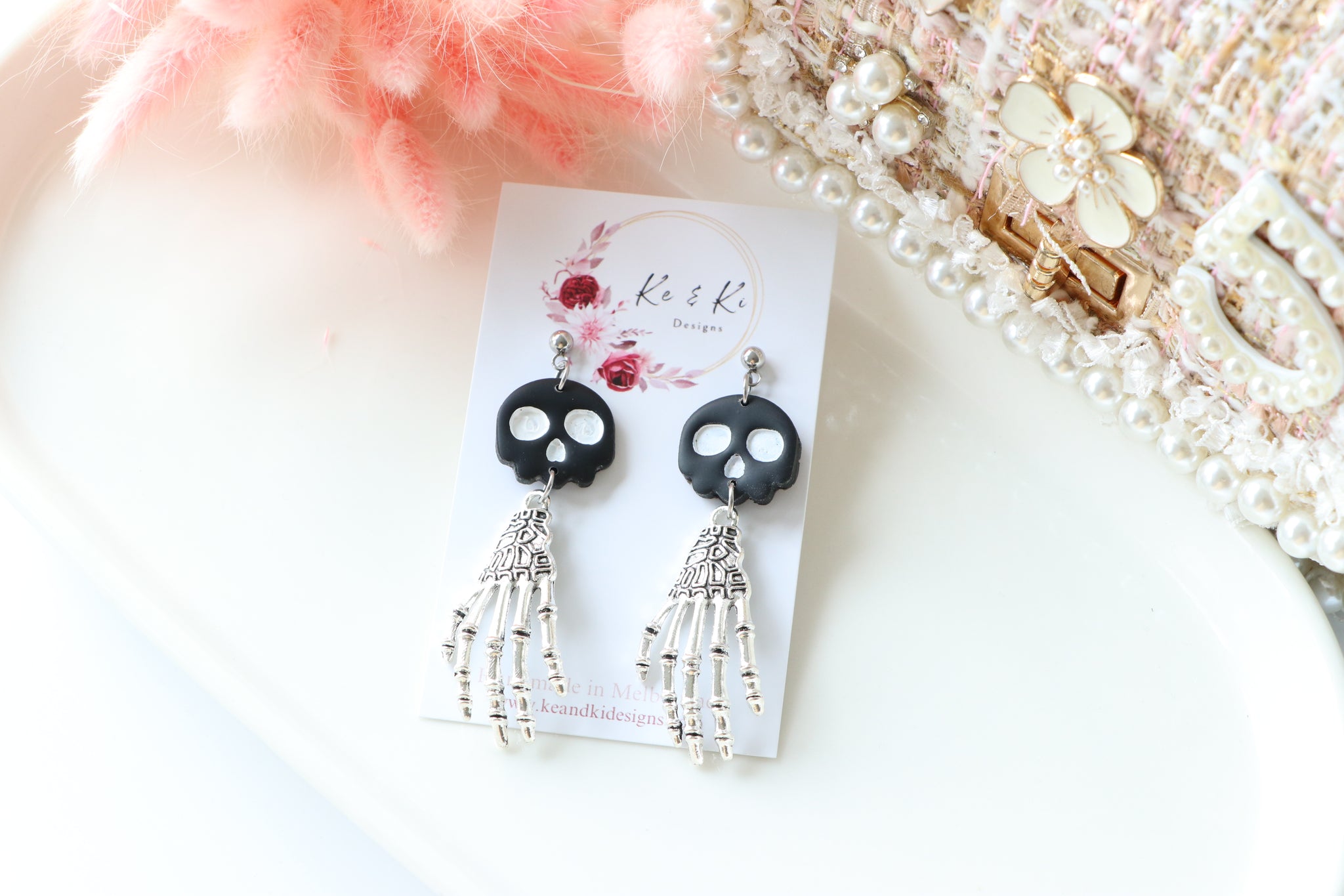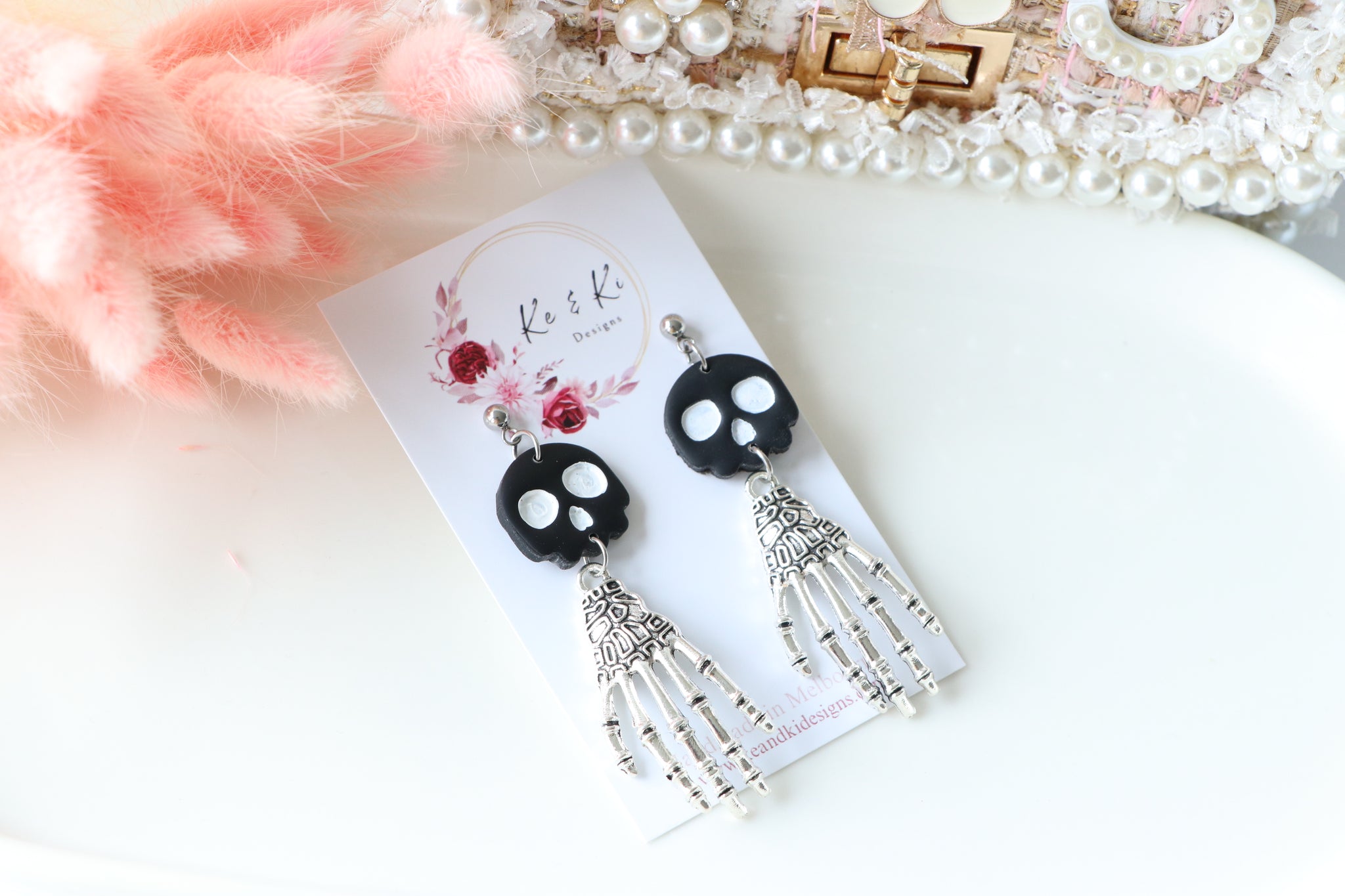 Add a touch of eerie elegance to your spooky-season look with our Tiny Skull Head & Steel Skeletal Hand Dangle Earrings, handmade with love by KeandKi Designs.