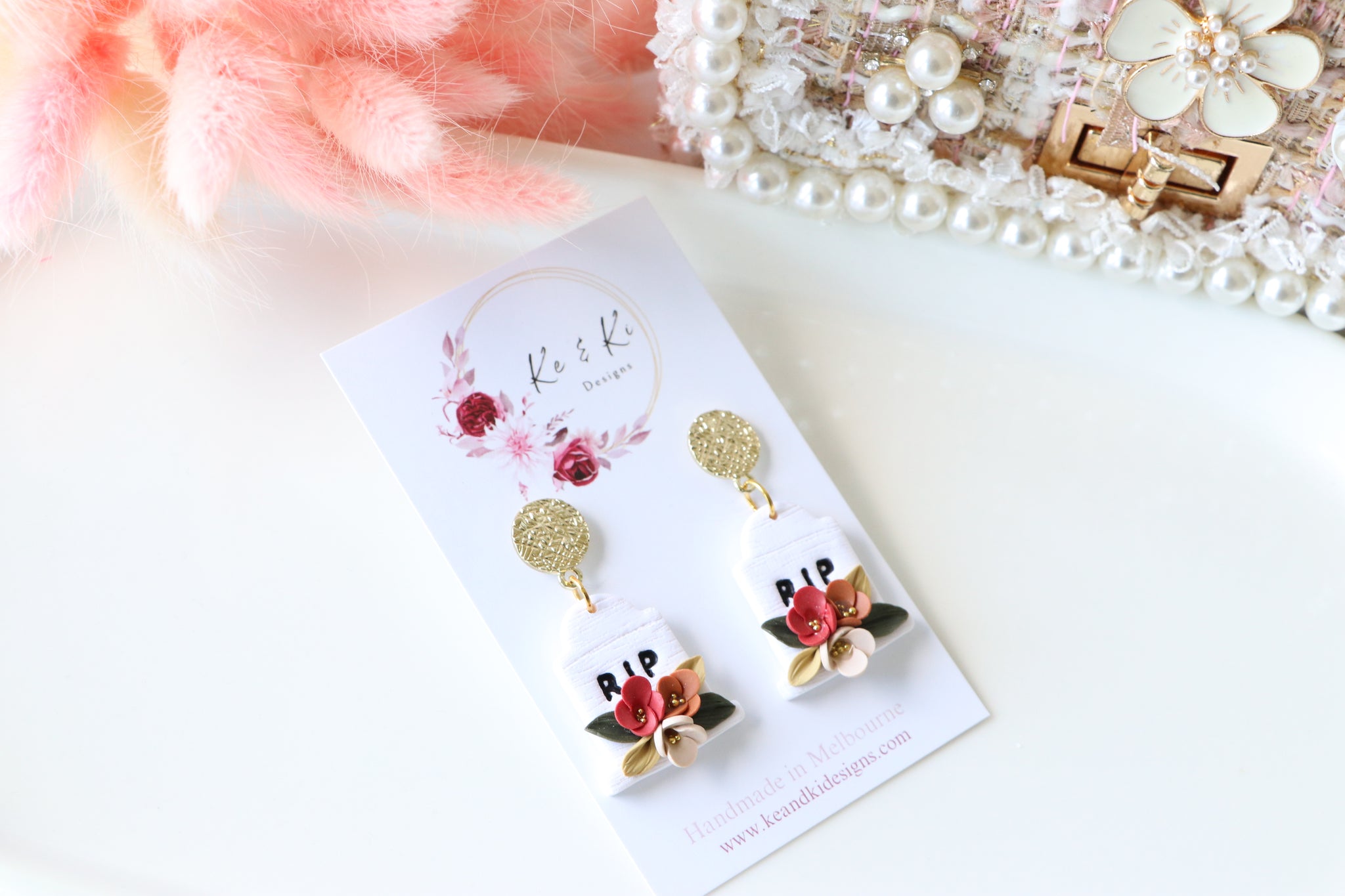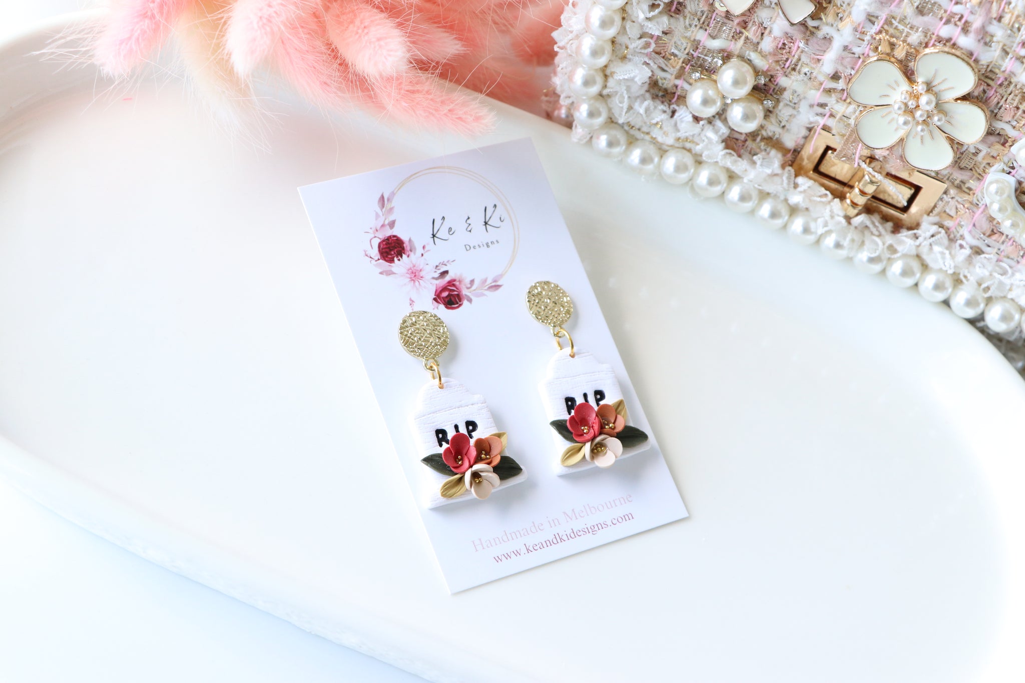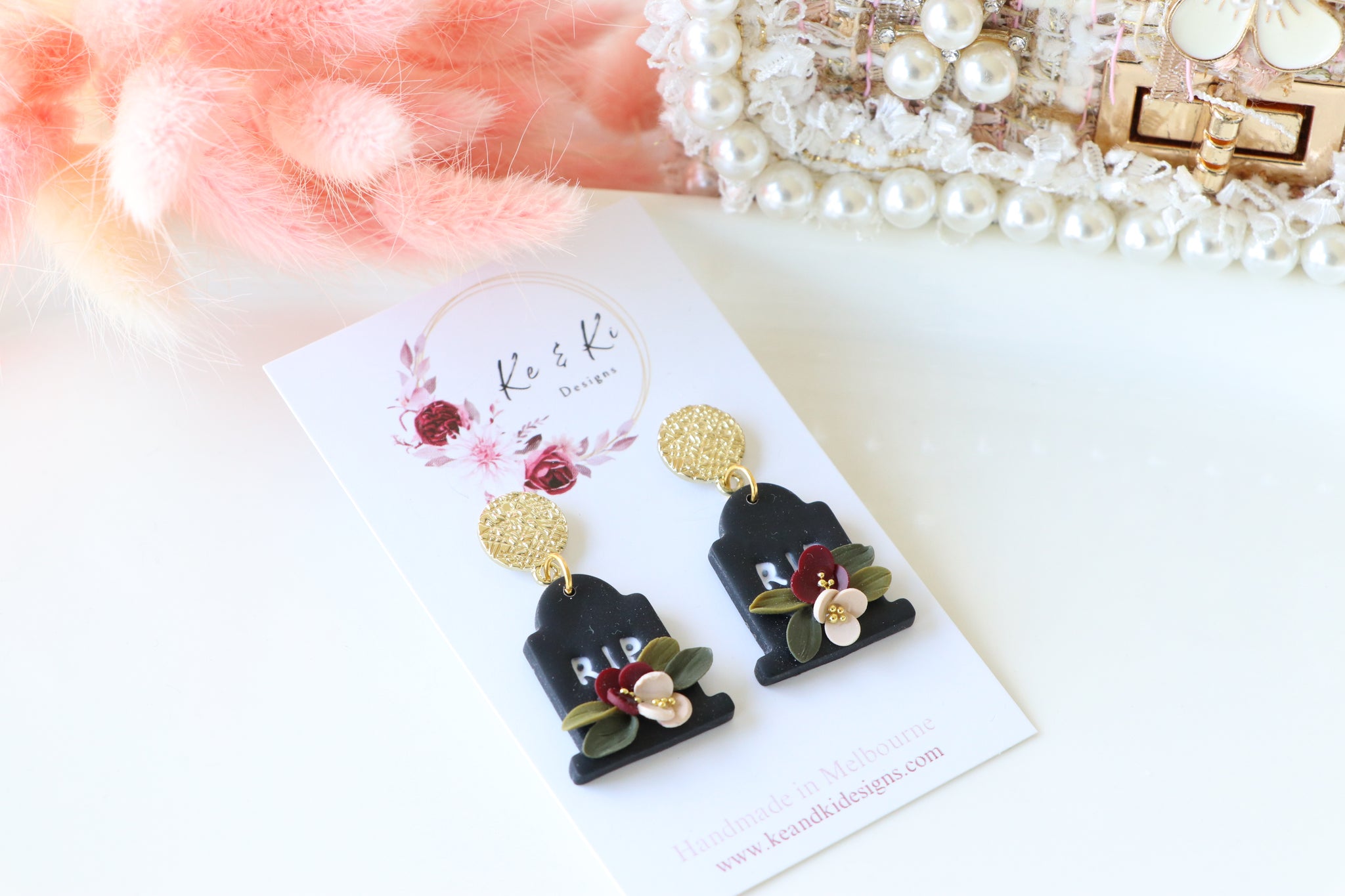 Embrace the beauty of darkness and bloom with our Tomb Polymer Clay Earrings, handcrafted exclusively by KeandKi Designs. These spooky yet elegant handmade earrings combine a gothic tomb design with delicate floral detailing, creating a look that’s both hauntingly beautiful and gracefully feminine.